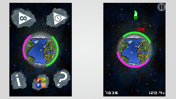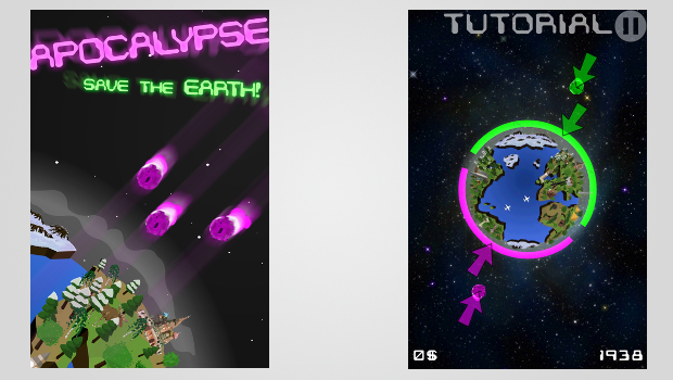 Hlavnou úlohou tejto apokaliptickej hry, je ochrana zeme pred dopadajúcimi asteroidy, pomocou dvoch energetických štítov, obklopujúcich našu matičku zem. Koncept hry je veľmi jednoduchý. Dotykmi prstov ovládate spomínané štíty, jeden zelený a druhý fialový. Dopadajúce asteroidyy prichádzajú zo všetkých strán a majú rovnaké farby, ktoré sa postupne striedajú. Cieľom je teda pohnúť štíty tak, aby asteroid dopadol na štít s príslušnou farbou. Za každý úspešný dopad dostanete určitý finančný obnos, ktorý je zároveň merítkom vašej úspešnosti.