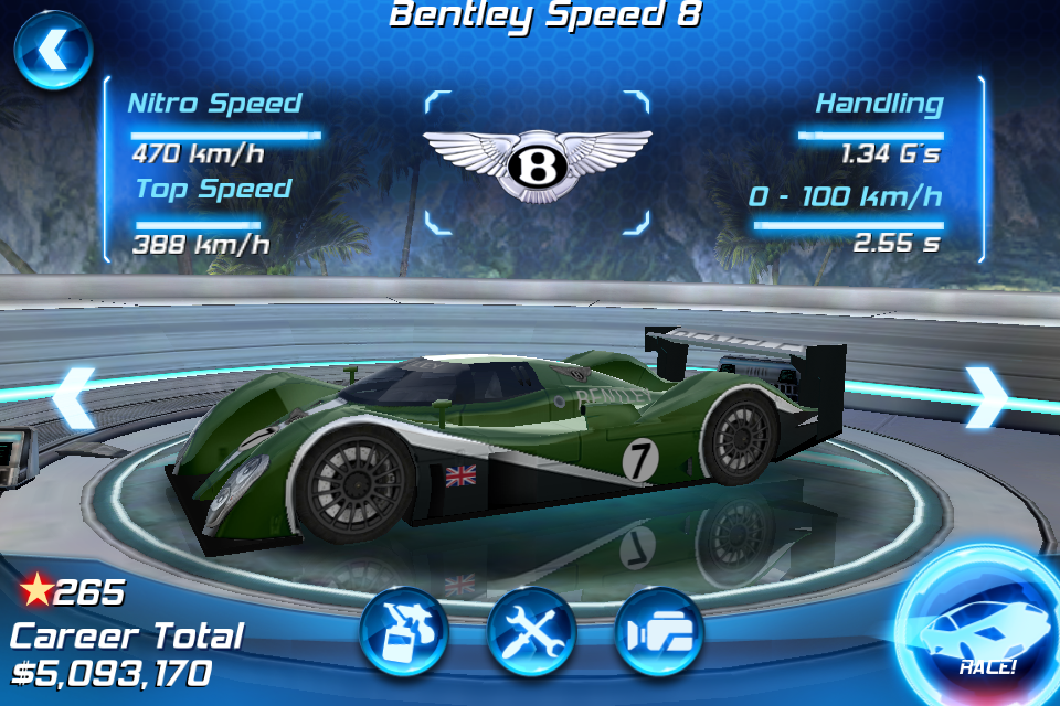 Počas kariéry môžete svoje auto tuningovať. Máte na výber zo 4 kategórií: Engine (motor), Handling (ovládanie), Nitro a Sponsorov, ktorí Vám počas kariéry ponúkajú určité výhody. Každé auto má k dispozícií určitý počet farieb, no niektoré majú len jednu, ako je napr. Bentley Speed B (dolu na obrázku), ktoré dostanete, keď dosiahnete tuším 265 hviezdičiek.