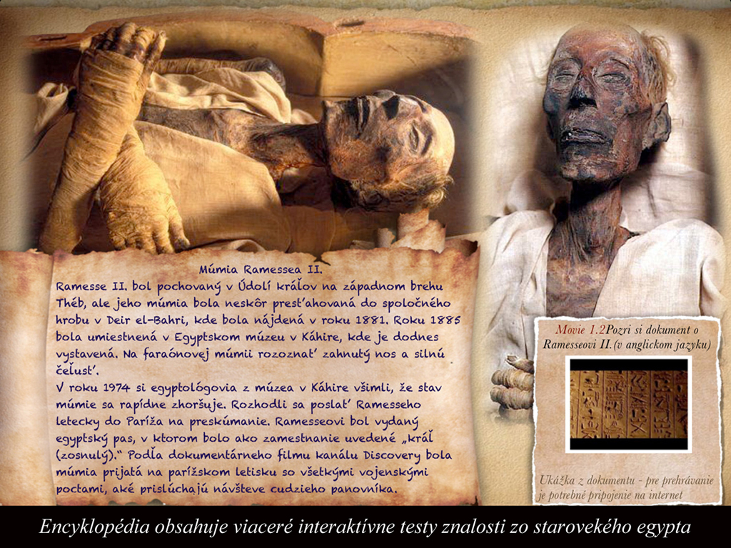 Prvá veľká interaktívna a multimediálna encyklopédia pre celú rodinu v slovenskom jazyku! Encyklopédia je obohatená o desiatky 3D modelov, video ukážok a množstvo máp. Určite sa zabavíte nielen pri hrách v knihe, ale aj pri interaktívnych testoch, ktoré preveria vaše znalosti z histórie Egypta.